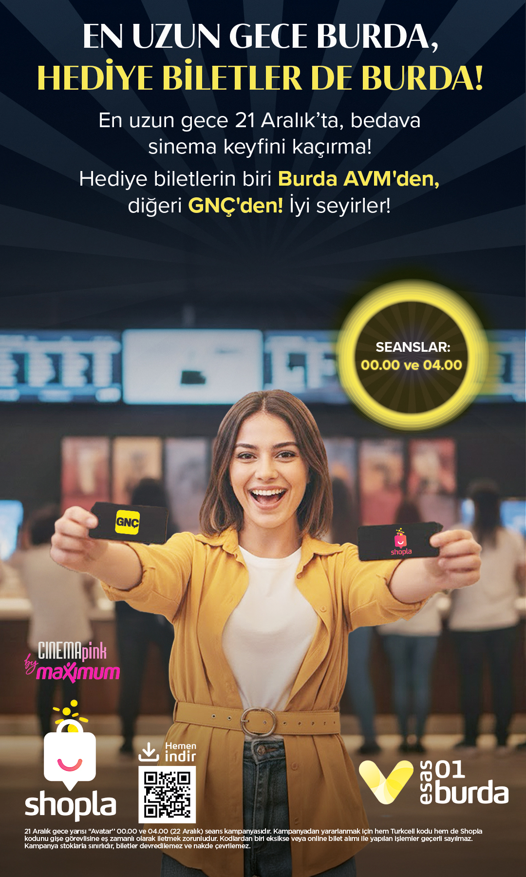 Türkiye’nin önde gelen ticari gayrimenkul yatırım şirketlerinden Esas Gayrimenkul tarafından hayata geçirilen Burda AVM’ler, Shopla ve Turkcell iş birliğiyle sinema keyfini farklılaştırıyor ve yılın en uzun gecesini sosyal bir etkinliğe dönüştürüyor. Sinemaseverlere yılın en uzun gecesinde avantajlı, keyifli ve enerjik bir sinema maratonu sunmayı amaçlayan “En Uzun Gece Sinema Maratonu” kampanyası, 21 Aralık 2025 Pazar gecesi Burda AVM’lerde gerçekleşecek olan film seanslarının biletlerini ücretsiz hediye ediyor.