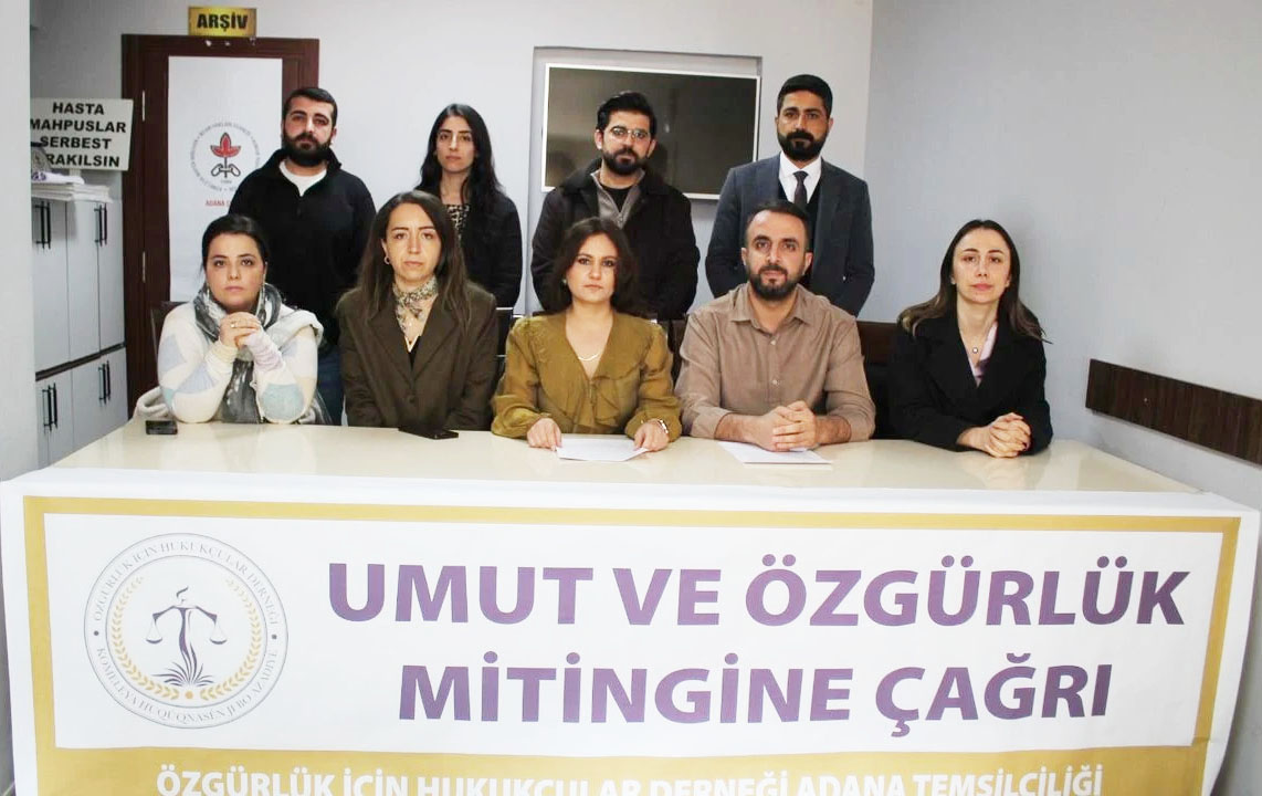 (HABER MERKEZİ)-Özgürlük İçin Hukukçular Derneği (ÖHD) Adana Temsilciliği, İHD Adana Şubesi’nde yaptığı basın açıklamasıyla 4 Ocak’ta Diyarbakır’da düzenlenecek ‘Umut ve Özgürlük Mitingi’ne çağrı yaptı. Açıklamada, umut hakkının tanınmasının barışın ve demokratik toplumun ön koşulu olduğu vurgulandı. Türkçe ve Kürtçe olarak okunan açıklamada, Türkçe metni Av. Zelal Demiray, Kürtçe metni ise Av. Sabri Sari okudu.