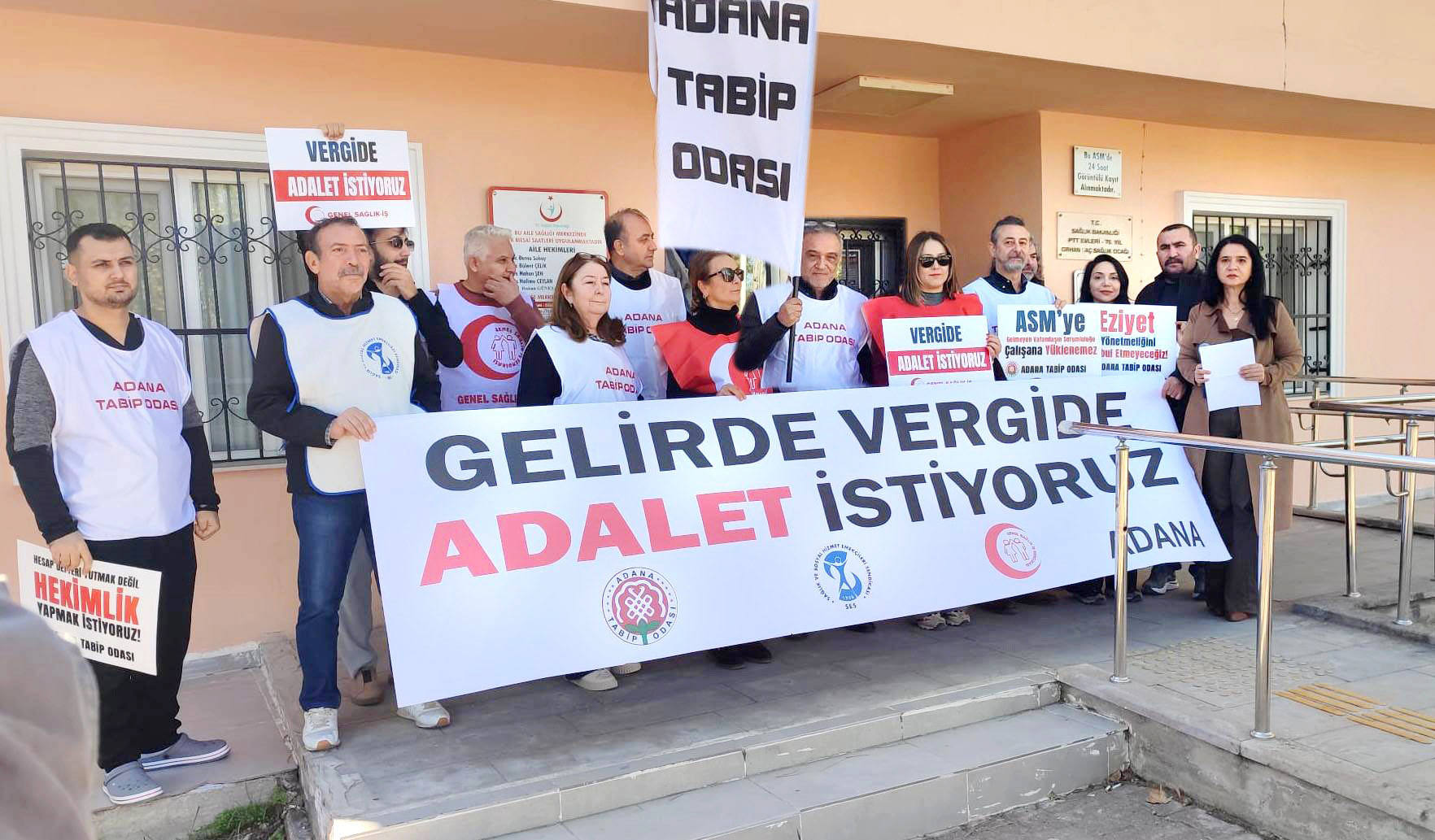 (HABER MERKEZİ)-Adana Tabip Odası (ATO), Sağlık ve Sosyal Hizmet Emekçileri Sendikası (SES) ile Genel Sağlık İş Sendikası yönetici ve üyeleri PTT Evleri Orhan Taç Aile Sağlığı Merkezi önünde bir araya gelerek “Gelirde, Vergide Adalet İstiyoruz” sözlerini yeniledi.