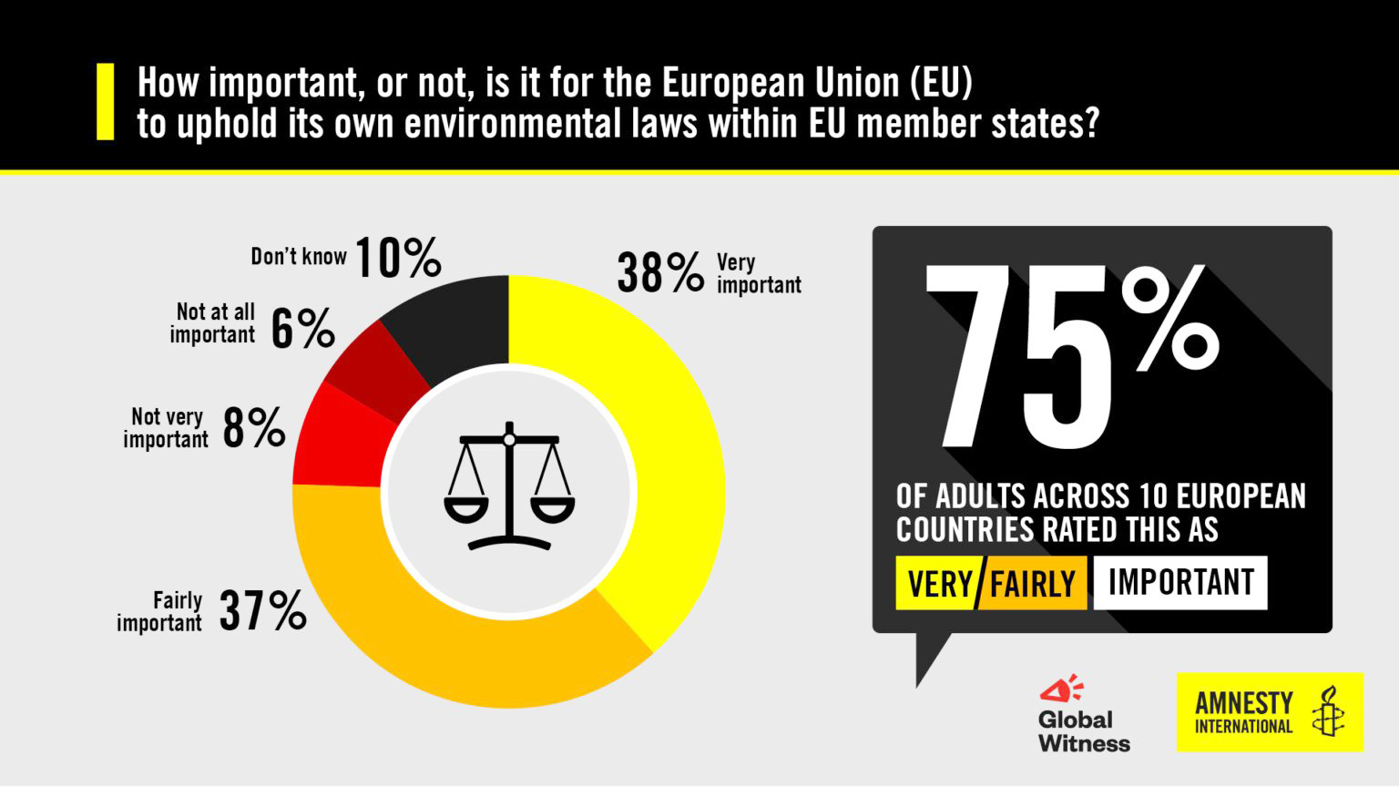 Uluslararası Af Örgütü ve Global Witness ortaklığıyla Ipsos’a yaptırılan, 10 bin 861 kişinin katıldığı ankete göre, 10 Avrupa ülkesinde insanların çoğunluğu (%75), AB’nin kendi çevre yasalarını uygulamaya koymasının önemli olduğunu düşünüyor. Yanıt verenlerin yaklaşık dörtte üçü, büyük şirketlerin küresel değer zincirleri genelindeki insan hakları zararları (%75) ve çevresel zararlardan (%77) sorumlu tutulması gerektiğini ifade ediyor.